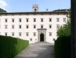 What began as a hermit's small wooden hut was followed by a built stone church in 1058. This was enlarged around 1450 and took on its current appearance at the end of the 15th century. In 1529, after the looting by Charles V, the east tower was built. Between 1575 and 1578, Galileo Galilei was educated there and then withdrawn by his father, before taking orders, and moved to Pisa to study medicine.[1] In the 17th century the walls were erected, and in the 18th century the fishing ponds dug. Today the monastery is open to tourists and its "Antica Farmacia" sells local produce such as herbal teas and liqueurs made following antique recipes. Among these is the rare and legendary Dry Gin of Vallombrosa.