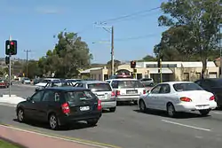 An intersection in South Australia. This intersection uses the Protected/Permissive right turn explained here. If right-turn traffic on the opposite side runs out, then the main light on the facing side will turn green with the shown arrow (in the distance) remaining green until it runs out of right-turn traffic.