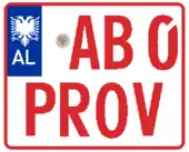 Test Vehicle registration plates in Albania have red borders and red texts on a white background. They follow the format [AA 0 PROV], where PROV stands for Provë which means Test.