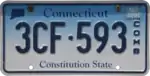 Embossed dark blue serial on reflective gradient sky blue and white plate with dark blue border line; "Connecticut" screened in dark blue centered at top; screened dark blue state shape at top left | "Constitution State" screened in dark blue centered at bottom | 123·ABC2 | 100·NZN to 999·ZZX | 'O' series not used; 'V' series reserved for Veteran plates. |