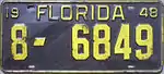 1948 | Embossed yellow serial on black plate with border line; "FLORIDA" centered at top; "19" at top left and "48" at top right | none | 1T-1234 10T-123 1D-1234 10D-123 1-12345 1-1234A 10-1234 10/12345 1W12345 10W1234 1WW1234 10WW123 |