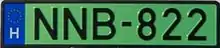 - Since October, 2015 it is possible to ask for green backgrounded plates for plug-in hybrids and electric cars which meet certain criteria.[15] Owners of these cars enjoy some benefits (e.g.: free parking in Budapest and some other cities).[16] Usually certain letter combinations are dedicated from the normal series which are all green plates from 001 to 999. These letter combinations are: NLE, NNB, PAV, PDA, PMY, PPZ, PUL, PXA, PYA, REW, RIA, RKZ, RMY, RMZ, RNY, RPZ, RVZ, RZZ, SAA, SAB, SDZ, SEA, SEZ, SFZ, SHA, SIZ, SJZ, SMZ, SNY, SNZ, SOZ, SPA, SPY, SRA, SRZ, STZ, SUZ, SVZ, SXA, SXZ and SZX as of 2021. White plates from the normal series can be requested to be remade as a green plate, if the car meets the requirements.