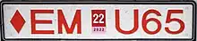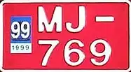 | Customs | 12 1234 12 | Four white numbers on a black background with two letters in a vertical red line on each side. | For temporary import. The number for the month on the left side and the year on the right side, indicating the duration of the registration. | |