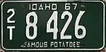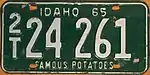 1968–70 Embossed green serial on white plate with border line; "IDAHO 68" centered at top "FAMOUS POTATOES" centered at bottom A 12345