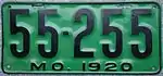 1920 Embossed black serial on light green plate with border line; "MO. 1920" centered at bottom 123-456 1 to approximately 309-000