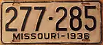 1936 Embossed black serial on white plate with border line; "MISSOURI-1936" at bottom 123-456 1 to approximately 678-000