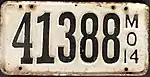 1914 Embossed black serial on white plate; "MO 14" at right 12345 1 to approximately 51000