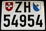 Vehicle license plates of Switzerland, are composed of a two-letter code for the canton and a number with up to 6 digits. The rear plates also display two shields with the flags of Switzerland and the respective canton. Since 1972, the sizes of the plates have been 300 x 80 mm (front) and 300 x 160 mm (rear). In 1987, the optional long format rear plates of 500 x 110 mm, which had been abolished in 1972, were reintroduced.[1]