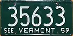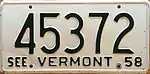 1958 | Embossed dark green serial on white plate; "VERMONT" centered at bottom; "58" at bottom right | "SEE" to left of state name, giving "SEE VERMONT" | 12345 | 1 to 99999 | |