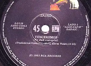 "Venceremos" is a Chilean song written by Claudio Iturra (an alternative version of text was written by Víctor Jara) and composed by Sergio Ortega for the 1970 election campaign of Salvador Allende. The title (pronounced [ben.seɾˈe.mos]) translates to "We shall prevail".