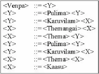 A set of well defined metric rules define the grammar for venba. Such rules have been proved to form a context-free grammar.[3]