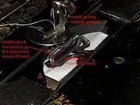 In order to create a lockstitch a sewing machine intertwines two threads: an upper thread (descending with the needle into the workpiece from above) and a lower thread (ascending into the workpiece from the bobbin below). To intertwine them, the machine must pass its shuttle (containing the bobbin and the lower thread) through a loop temporarily created from the upper thread.