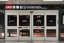 The bus transfer plaza connects with the station's original concourse at surface level. The 2008–2011 renovation introduced the station's prominent glazed entrance on Victoria Park Avenue, which was previously a windowless brick and concrete wall. This entrance consists of a large doorway, with a minimalist glass facade around it accentuated by panes of pink-red glass, including a coloured glass entrance canopy. Above the entranceway, vertical metal trusses are visible behind the glazing. This entrance opens onto a small but functional pedestrian plaza with benches, trees, newspaper boxes, and the entrance to the station's indoor bicycle storage area.[6] The concourse also received contemporary porcelain tiles on certain walls and clear glass mosaic tiles on columns in the renovation. Its ceiling was refinished to include a series of inwardly-sloped sections for visual interest.