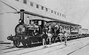 ![]() The Deniliquin and Moama Railway Company's locomotive No.1, with Mixed Train, at Deniliquin on the Opening Day, 4 July 1876 | |||||||||||||||||||||||||||||||||||||||||