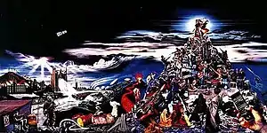 The cover art was by Mark Wilkinson, who had illustrated all Marillion albums and singles while Fish was their singer and went on to design almost all Fish solo covers. The front cover features a close-up from a larger, very detailed painting/collage inside the gatefold LP cover and the CD booklet. The painting contains many references to the lyrics, political allusions as well as "hidden" messages only understandable to fans (such as the faces of Marillion's keyboardist Mark Kelly and manager John Arnison). The central element is a "hill" consisting of junk consumer goods in a post-apocalyptic landscape, on top of which a couple clad in pseudo-oriental clothes stare into the distance, holding an hourglass. The man's cape, flapping in the wind, resembles the east of Scotland, with the Southern Uplands (Fish's home region) lit by light beams apparently emitted by the hourglass – a reference to Fish's interest in Scottish culture. Only the couple and the top of the hill are on the front cover. The TV sets and the Amiga 500 computer set the couple is standing on show pictures of Fish's face; on the larger version inside, these are replaced with faces from Ingres' painting The Golden Age.