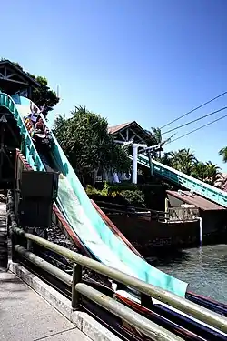 In the late 1970s, Sea World set about adding a log flume to their park.[2] American firm Arrow Dynamics was approached, however, they asked $1.5 million to construct it.[3] John Menzies decided this price was too high and began constructing the ride in-house.[3] He made several overseas trips to measure the dimensions of similar rides.[4] The final cost of the ride turned out to be $350,000 - a fraction of what Arrow Dynamics wanted.[5][6] After a soft-opening in 1978, the ride officially opened in March 1979.[2][5] In late 2012, the ride's course was rerouted to make way for the construction of the park's 2013 attraction, Storm Coaster, on the site of the former Bermuda Triangle ride.
