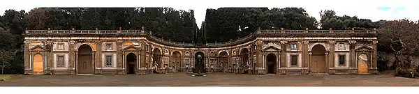 The villa is aligned with the cathedral down its axial avenue that is continued through the town as Viale Catone. The villa has an imposing 17th century facade and some other interesting architectural and environmental features, such as the double gallery order on the rear facade, the spiral-shaped flights, the large exedra of the Water Theatre and a magnificent park.