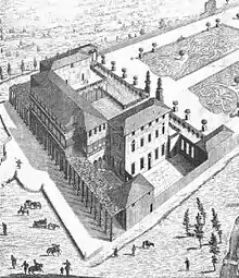 The U-shaped plan opens towards the garden. The classical-style façade includes a nine-arched portico, with a barrel vault, supported by pillars adorned with Tuscan-style semicolumns resting on square plinths. The portico is surmounted by two orders of logge with balustrades, one with Tuscan columns and the other with columns with Corinthian capitals.[1]