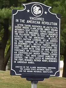 Vincennes was far from centers of British power. In 1770 and 1772, Thomas Gage, the commander in chief of Britain's North American forces, received warnings that the residents of Vincennes were agitating against the Crown, and were inciting native tribes along the river trade routes to attack British traders. The Colonial Secretary, the Earl of Hillsborough, ordered the residents to be removed from Vincennes in response. Gage demurred while the residents responded to the charges against them, claiming to be "peaceful settlers, cultivating the land which His Most Christian Majesty [meaning the King of France] granted us." The issue was resolved by Hillsborough's successor, Lord Dartmouth, who insisted to Gage that the residents were not lawless vagabonds, but British subjects whose rights were protected by the Crown. Gage took no action against the residents of Vincennes.[14] In 1778, residents at Poste Vincennes received word of the French alliance with the American Second Continental Congress from Father Pierre Gibault and Dr. Jean Laffont. They mobilized in support of the American revolutionaries, as did the local Piankeshaw, led by Chief Young Tobacco.