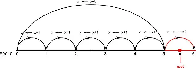 See the corresponding diagram where the root lies in the interval (5, 6). It can be easily inferred that, if the root is far away from the origin, it takes a lot of time to find its integer part this way, hence the exponential nature of Vincent's method. Below there is an explanation of how this drawback is overcome.