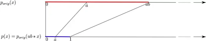 - Given a polynomial porig(x) of degree deg(p), such that porig(0) ≠ 0, whose positive roots must be isolated, first compute an upper bound,[12][13] ub on the values of these positive roots and set p(x) = porig(ub * x) and (a, b) = (0, ub). The positive roots of p(x) all lie in the interval (0, 1) and there is a bijection between them and the roots of porig(x), which all lie in the interval (a, b) = (0, ub) (see the corresponding figure); this bijection is expressed by α(a,b) = a +α(0,1)(b − a). Likewise, there is a bijection between the intervals (0, 1) and (0, ub).