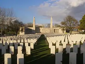 The Vis-en-Artois Memorial is a World War I memorial located near the commune of Vis-en-Artois, in the Pas-de-Calais département of France. The memorial lists 9,843 names of British and South African soldiers with no known grave who were killed during the Advance to Victory, from 8 August 1918 to the Armistice (11 November 1918). The area of the frontline covered is described as "in Picardy and Artois, between the Somme and Loos". Canadian, Australian and New Zealand forces that fell during this period and were not found, are commemorated elsewhere on other memorials to the missing.[1][2]