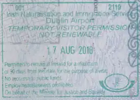 - ↑ "Immigration permission for non-EU/EEA & non-Swiss nationals". Department of Justice and Equality. 21 August 2017. Retrieved 2 April 2020.