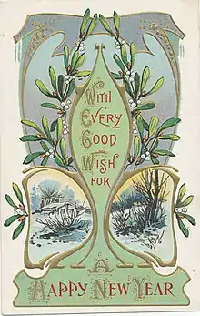 According to an old Christmas custom, a man and a woman who meet under a hanging of mistletoe were obliged to kiss. The custom may be of Scandinavian origin.[26] It was alluded to as common practice in 1808[27] and described in 1820 by American author Washington Irving in his The Sketch Book of Geoffrey Crayon, Gent.: