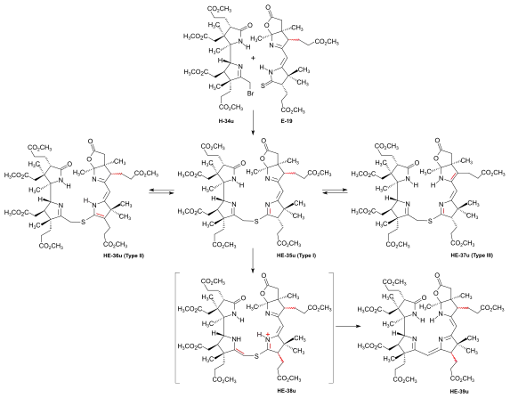 - ↑ For a review about syntheses of corrins, see[27]; this includes more recent synthetic approaches to vitamin B12 by the groups of Stevens,[27]: 293-298 Jacobi,[27]: 298-300 and Mulzer,[27]: 300-301 as well as references to approaches by Todd or Cornforth (see also[45]: 261-268 ) preceding the efforts by Eschenmoser and Woodward.[18]: 1493-1496