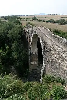 The Ponte dell'Abbadia[17] over the Fiora is a Roman bridge with a main arch of 20 m span and 30 m above the stream and was built upon an Etruscan bridge. (The Tufo buttresses are very probably Etruscan, for they are evidently the piers of the original bridge.) It carried the ancient road and the Romans, unusually, incorporated an aqueduct on it leading to Vulci about 1.5 km away. The overflow of the aqueduct after it fell into disrepair caused the "curtain of stalactites".