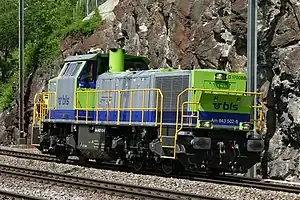 An order with the Swiss Federal Railways for 59 diesel locomotives to replace the Bm 6/6 and Em 6/6 types for heavy shunting in freight yards, and trip and construction work resulted in the SBB Am843. The locomotives use a Caterpillar Inc. 3512B DI-TA SCAC engine rated at 1,500 kW (2,000 hp) and Voith L5R4zseU2 two speed hydraulic transmission giving a 40 km/h (25 mph) top speed in the lower gear.[9] The locomotives also have a particulate filter engineered by Hug Engineering of Switzerland which reduces NOx and particulate emissions to low levels.[10][11]