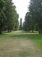 Three great vistas are Nesfield's signature on today's Kew Gardens, London. In a 'goose foot' pattern radiating from the Palm House, Pagoda Vista was a grassed walk some 850 m (2,800 ft) long; Syon Vista was a wide gravel-laid walk stretching 1,200 m (3,937 ft) towards the Thames; while the third, short, vista fanned from the northwest corner of the Palm House and focused on a single 18th-century cedar of Lebanon towards Kew Palace. Pagoda Vista is lined with paired broadleaved trees with, flanking them and to their exterior, paired plantings of evergreens. Nesfield's idea of being able to both see and walk to the Pagoda along the centre line of Kew Gardens was, in fact, a return to the turn-of-the-century landscape.