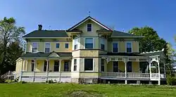 Built on the edge of town in about 1876 for W. C. and Mary Ball, the house is a transitional structure between the Italianate vernacular and that of the later Victorian picturesque styles.[2] The 2½-story frame house features bracketed eaves, a full-height bay section on the south elevation, cornice returns, a high-pitched roof, facade gable, crenellations and finials on the ridges. A prominent feature of the house are its three porches: a kitchen porch on west side, a dining room porch on south, and wrap-around porch on southeast.