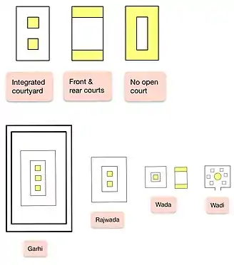 Integrated open courtyard wada are the most popular ones with a courtyard in the center, semi-open spaces around it and then enclosed spaces. These are mostly Garhi or Rajwada types.
