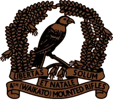 The cap badge of the 4th (Waikato) Mounted Rifles dates from shortly before the First World War: a native Kaka parrot within a wreath of kowhai leaves and blossoms. The Latin motto, "Libertas et Natale Solum" is best translated as "Liberty and Homeland".[7]