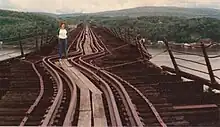 On May 8, 1974, a tie fire damaged about 700 feet (210 m) of decking and underlying girders on the bridge's eastern section.[23] It was likely started by a spark from an eastbound Penn Central freight train that had just crossed the span.[24] The Penn Central had neglected the bridge's fire-protection system, which had no water on the day of the fire, and had laid off employees who kept watch for such fires.[13] A photograph of the last train, a run-through from the Erie Lackawanna, was included in a 40th anniversary web feature by the Poughkeepsie Journal.[25]