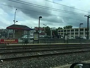 Walnut Street is a SEPTA Media-Sharon Hill Trolley Line stop in Upper Darby Township, Pennsylvania. It is officially located at Garrett Road and Walnut Street, but Bywood Avenue is also included as it parallels the north side of the line. The station serves both Routes 101 and 102, and only local service is provided on both lines. The station contains two platforms with plexiglass bus-type shelters on both sides of the tracks, both of which are at the far end of each platform.