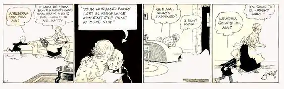When I was 16, I worked as office boy for Tad, Herriman, Hershfield, Tom McNamara, also Hoban, McCay, Gross, T. E. Powers, C. D. Batchelor, Sterrett and Segar. Not much money but a million dollars worth of experience! Stayed with the New York Journal for five years, sweeping floors, running errands, drawing strips, sport cartoons and what have you. Then one year with World Telegram. From there to the Daily News in 1922 where Smitty and Herby work for me![3]