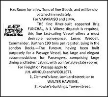 Hawkins advertised in newspapers from about 1818, usually in the Public Ledger and Daily Advertiser, to invite cargo and often passengers for ships sailing from London. They were typically coppered Brigs (120–220 tons) and usually destined for South America, including the Funchal which sailed for Valparaiso and Lima in 1827, under the command of James Weddell.