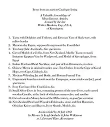 Hawkins left his large collection of coins and medals to the United Services Institute in London. It is now the Royal United Services Institute for Defence & Security Studies (RUSI) in Whitehall. The RUSI Museum was housed in the Banqueting House, Whitehall but the collection was broken up when the government of the day regained full use of the Hall in the early 1960s.[23] There seems to be no record of where items from the collection went. The lease on Hawkins's house, together with several items of furniture and “20 doz. of choice Madeira and other wines”, were auctioned in May 1862.[24] About two months later, on 11 July 1862, Messrs. S. Leigh Sotheby & John Wilkinson auctioned “a valuable assemblage of miscellaneous articles of ancient, mediaeval and modern art, formed by the late Walter Hawkins, Esq., F.S.A. of Kensington.” The front page of the auction catalogue gives a good indication of the range of objects he had amassed, perhaps as a result of his ship broking activities.