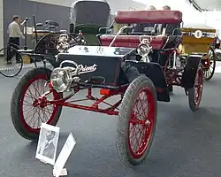 In 1902, Metz left the company, founding Metz Motorcycle Company and C.H. Metz Company in town soon after. Engineer Leonard B. Gaylor succeeded him at WMC. The same year, Gaylor introduced a very light model with friction drive, sold as the Orient Buckboard. It seated 2 passengers and sold for just $425 (equivalent to $14,375 in 2022), making it the lowest-priced automobile available. The vertically mounted air-cooled single-cylinder engine, situated at the rear of the car, produced 4 hp (3.0 kW). The car had tiller steering, weighed 500 pounds (230 kg) and had a 100 mi (160 km) range, though minimal springing and the complete lack of any bodywork made it less than practical for a long journey. In the next years, it was offered in several models (including a diminutive delivery car), got an improved suspension, steering wheel, two chains instead of one belt to transmit the power to the rear wheels, and an optional 8 hp (6.0 kW) two cylinder engine. It remained in production until 1907.[2][1]