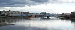 The contract for the new bridge was awarded to Messrs Holloway Brothers (London), and work began in 1937.[21] A temporary footbridge that had been used during the redevelopment of Chelsea Bridge between 1935 and 1937 was re-erected alongside Wandsworth Bridge, and the existing bridge demolished. The new bridge was expected to be complete in 1939; however, a shortage of steel in the buildup to the Second World War delayed its opening until 25 September 1940.[20] The steel panels cladding the bridge were painted in varying shades of blue to camouflage it from German and Italian air raids, a colour scheme it retains today.[17] Although it is one of London's busiest bridges, carrying over 50,000 vehicles per day,[2] its drab colour scheme and minimalist design have led to it being described as "probably the least noteworthy bridge in London".[22]