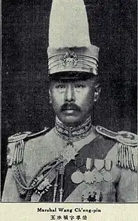 Wang Chengbin (Chinese: 王承斌) (August 21, 1874 February 15, 1936) was an ethnic Manchu Chinese general of the Warlord Era of the Republic of China. He was the father of Hong Kong cartoonist Alfonso Wong. Born in Fengtian (now Liaoning) Province, Wang attended Baoding Military Academy from 1907–09, and shortly thereafter joined the New Army and was stationed in Changchun, Jilin Province. In October 1911, after the outbreak of the Wuchang Uprising, he was sent to Shanxi Province to suppress supporters of the Xinhai Revolution. In August 1912, he was appointed commander of the 11th Regiment, part of the 6th Brigade, 3rd Division. In the fall of 1913, he went with the 3rd Division to Yuezhou (now Yueyang in Hunan) to suppress the Second Revolution. In 1915, he went with the 3rd Division to Sichuan Province to suppress opposition to the Empire of China. In July 1917, he acted with Wu Peifu to overthrow Zhang Xun's Manchu Restoration.