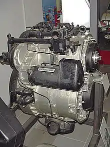 The first prototype, made of an NSU KKM 502 Wankel engine, was called R1 and featured a two stage design with two rotors and an 8-shaped housing. It had a compression chamber volume of 1.126 litre and borrowed its 0.5 litre combustion chamber displacement from the KKM 502.[14] In total, eight different evolutions of the R1 were made, named in alphabetical order, (R1A, R1B, R1C,...).[15] The fifth evolution, which as called R1E, had an increased 1.265 litre compression chamber, but it retained the 0.5 litre combustion chamber. Its power output was about 40 kW;[16] fuel consumption was approximately 220 g/kW·h.[17] The R2 had a 3-rotor design did not get beyond the draft stage; R3 was the first version of a powerplant with a greater displacement, capable of developing more power.[18] The first prototypes having the planned engine size, were called the R4 and R5. In the R5, the first rotor stage was only used for compressing the intake air, the exhaust gas was not used to power it. Instead, the exhaust gas was sent through an external exhaust gas turbine.[19]