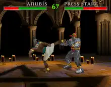 The Nintendo 64 version was delayed in order to tone down the difficulty level and add additional moves.[18] A Panasonic M2 version of War Gods was in development and slated to be one of its launch titles, but it never happened due to the system's cancellation.[19][20][21]