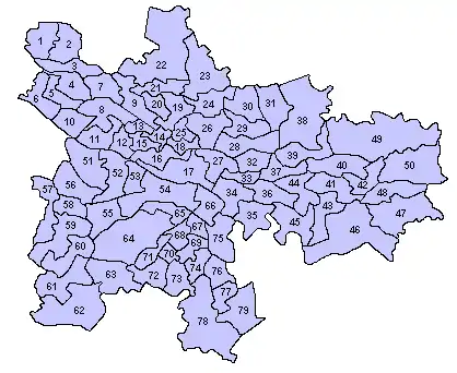 Map of 79 wards used in 1999 and 2003 council elections[9] (amended from 1995, 83 wards)[12]