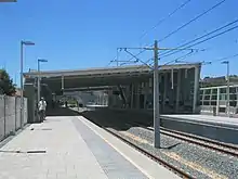The station consists of two side platforms, approximately 150 metres (490 ft) long, or long enough for a Transperth six-car train – the longest trains used by Transperth. The station's entrance leads onto platform two. Platform one can be accessed through a pedestrian overpass which links to the platforms by stairs, an escalator and a lift. The station has a large roof covering much of the platforms. The station is fully accessible.[1][5][6] At the station building entrance is a seven stand bus interchange. Surrounding the bus interchange is the station's car park. It has 790 regular parking bays, 22 short term parking bays, 39 motorcycle bays, and disabled bays. Other facilities at the station include a transit officer booth and toilets.[5][6]