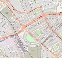 Close to the southern end, with its main entrance on Warwick Road, was the Earls Court Exhibition Centre built from 1935 to 1937 and demolished in 2017 to be replaced by apartment blocks and shops.[7] Opposite is the grade II listed 1937 extension to Earl's Court tube station, a rotunda of brick and glass with a 1970s circular atrium that Historic England describe as being of "no merit".[8]
