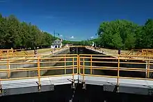 Construction of the Waterford Flight began in 1905 and took 10 years to complete.[1][2] The 5 massive locks dwarfed the previous iterations and were mandated to be 328 feet (100 m) long, 45 feet (14 m) wide, and 12 feet (3.7 m) deep.[2] These dimensions became the standard on the Barge Canal System and have been maintained to this day. In addition to the locks, there are two large guard gates at the northern end of the flight. These gates can be lowered to block additional flow of water from the Mohawk River through the locks to prevent damage during floods.[3] The locks have undergone periods of major restoration in the past couple of decades, including replacement of lock doors and resurfacing of the concrete within the locks themselves.[4]