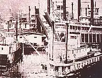 After the war, the steamboat Mountain Boy transported government officials and documents to Charleston from Wheeling after seven years there. The steamboats Emma Graham and Chesapeake moved the state's officials and documents back to Wheeling in 1875. After a citizens' vote in August 1887, the steamboats were again called on to move the state government and records back to Charleston. In May 1885, state government officials moved from Wheeling to Charleston on board the sternwheeler "Chesapeake." The ward barge "Nick Crewley" held the state records and library. It was pushed by the steam towboat "Belle Prince."[34]